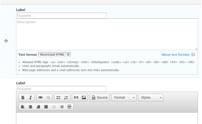 Peut-être que vous commencez à comprendre ou je veux en venir ?? Dans mon cas, je veux un champ de type "textarea" (la description), et qu'il soit complété avec un champ de type "textfield" (le label).