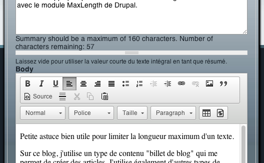 Bref. Je suis tombé sur le module "MaxLength", qui, dans les grandes lignes, permet d'appliquer une limite au nombre de caractère d'un champ texte. Malheureusement, le champ "body" par défaut d'un contenu, avec son second champ "résumé", est un peu spécial. MaxLength me permettrait de limiter le champ body, mais pas la partie résumé. J'ai donc continué les recherches jusqu'à trouver une petite explication sur "comment appliquer par code" le comportement du module MaxLength (malheureusement je n'ai pas retrouvé le lien... c'était sur stackoverflow).