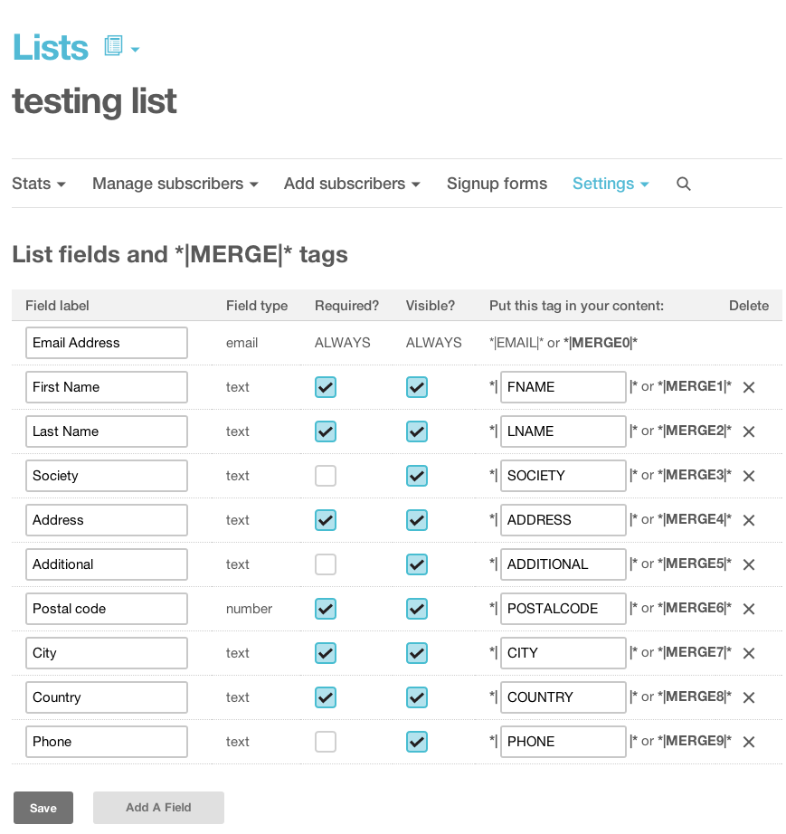 Une fois cette étape passée, il est nécessaire de créer une “Liste d’abonnés”. Cliquez dans le menu de gauche sur “Lists”, puis en haut à droite sur “Create list”. J’ai nommé ma liste “testing list”. Dans le menu secondaire, on peut trouver un onglet “settings”, puis un sous-menu “List fields and *|MERGE|* tags". C’est ici que nous allons déclarer les données à recueillir pour nos abonnés.