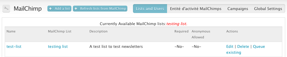 Les listes d'abonnés (Mailchimp) et les listes de diffusion (Drupal) sont intimement liées, mais dans Drupal, une liste de diffusion va permettre de générer un bloc d'inscription ainsi qu'un formulaire disponible sur le profil utilisateur pour que l'utilisateur puisse gérer son ou ses abonnements.