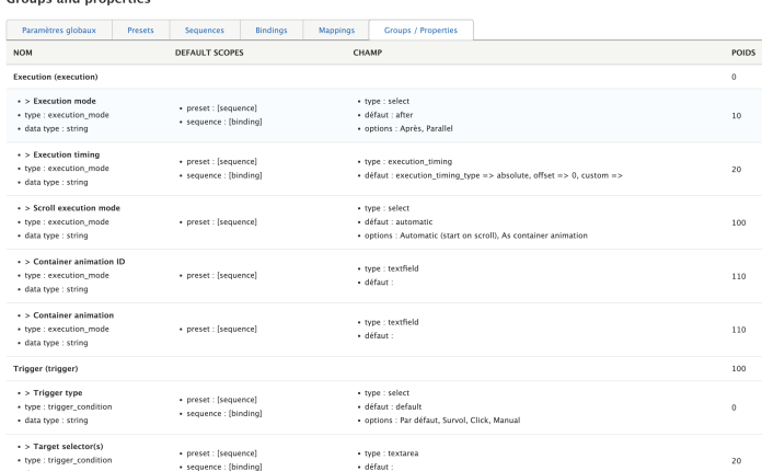 Ces propriétés permettent de générer un système de formulaire pour que l'utilisateur puisse remplir les propriétés associées à un preset. Là, je parle de presets, mais j'ai des propriétés pour chaque type d'entité (preset, sequence, mapping, binding).