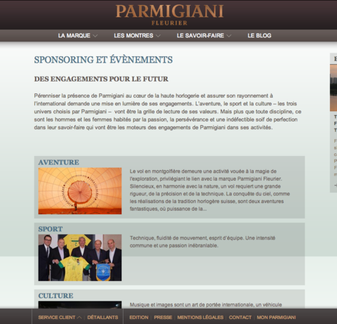 Parmigiani Fleurier official website implementation. The official website presents the company in various aspects :